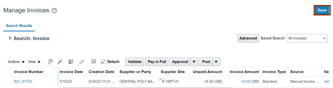 Step 11.    Click the Done button. This will redirect you to the Manage Invoices page.