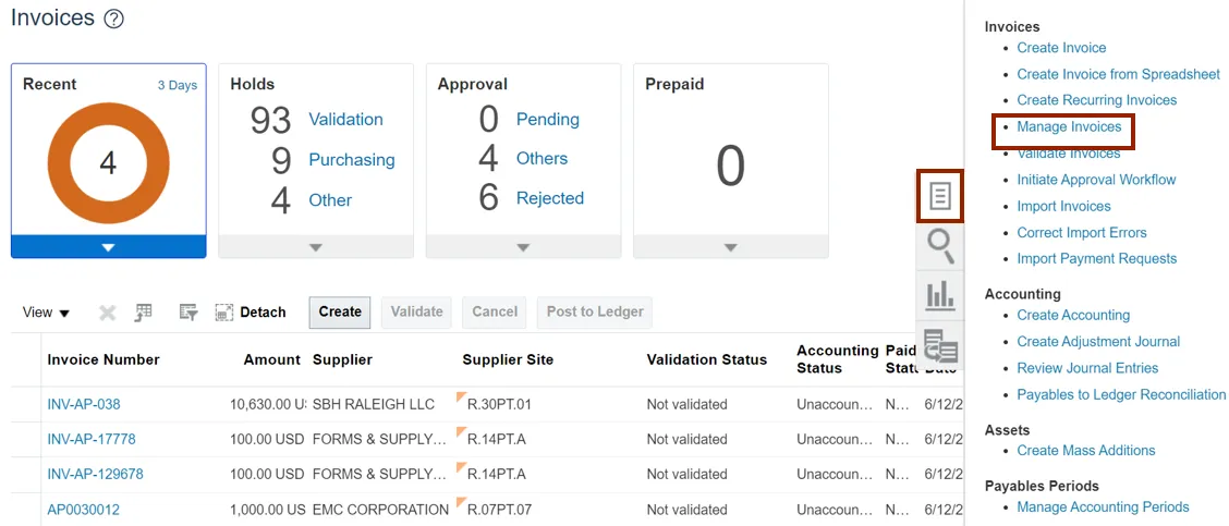 Step 3.    On the Invoices dashboard, click the Tasks icon and click Manage Invoices.