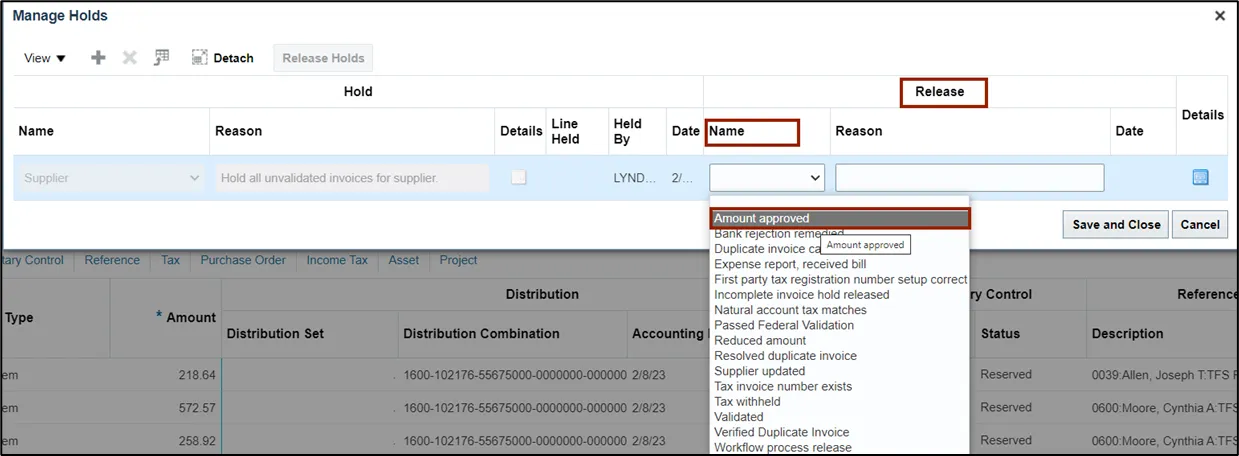 Step 12.    On the Manage Holds pop-up window, under the Release section select the appropriate option from the Name drop-down choice list.
