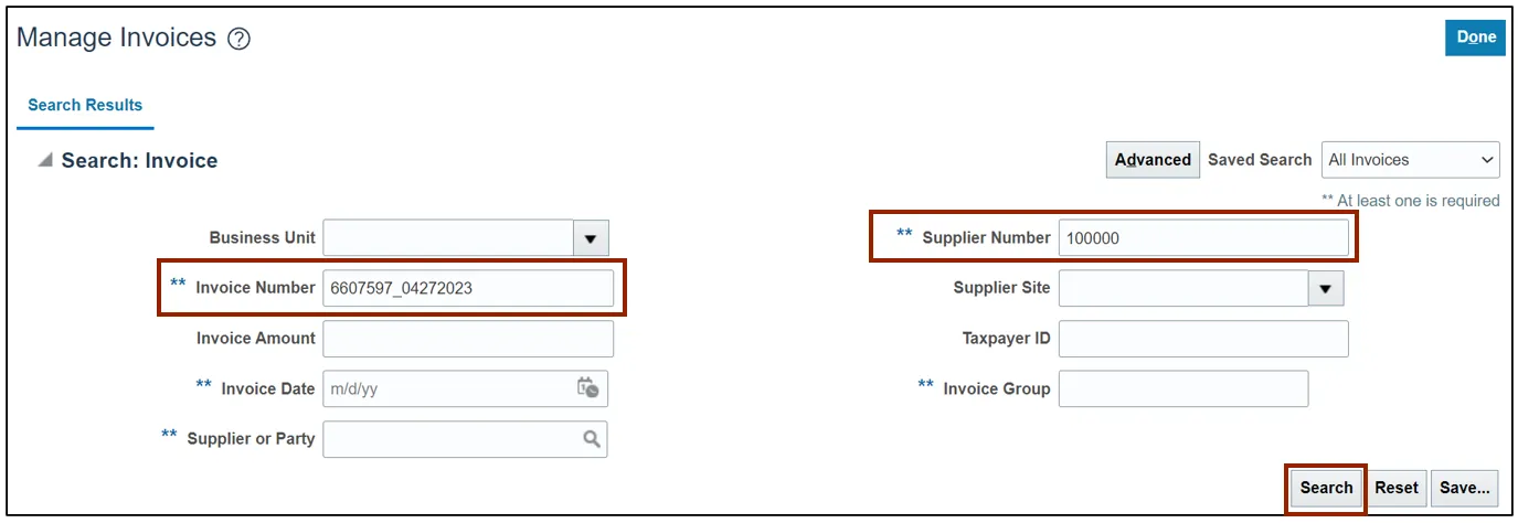 Step 4.    On the Manage Invoices page, enter the Invoice Number and Supplier Number. Click the Search button.