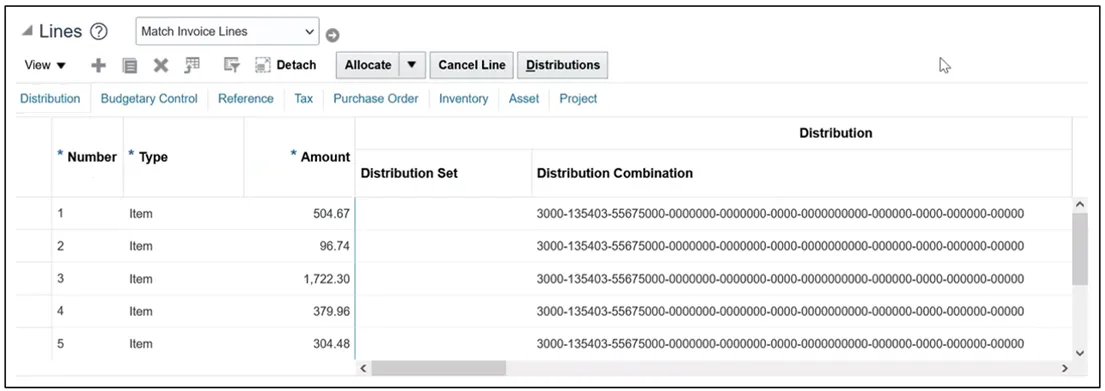 Step 7.    On the Edit Invoice page, under Lines section, select the Distribution button. The Manage Distributions window opens.