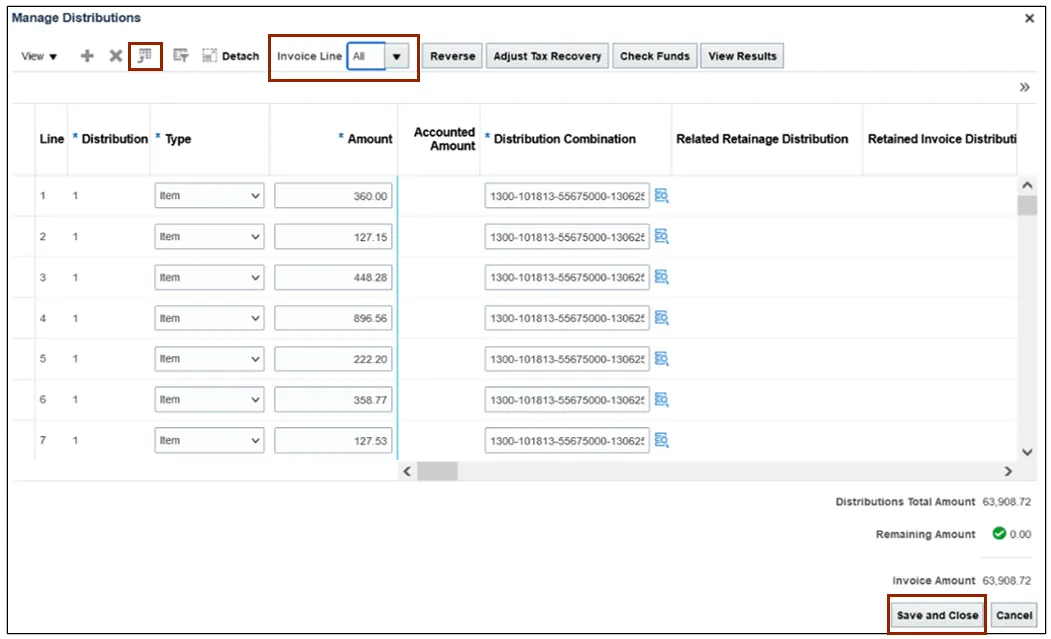 After verifying or changing the invoice line distributions, click the Save and Close button.