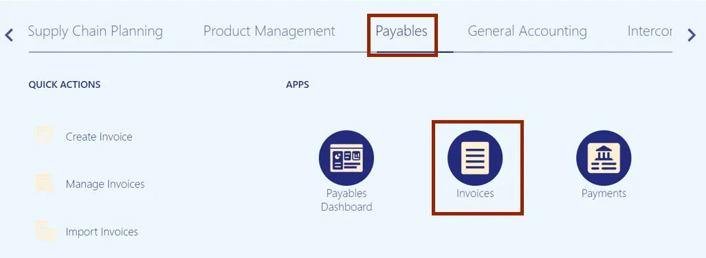 Step 2.    On the Home page, click the Payables tab and click the Invoices app.