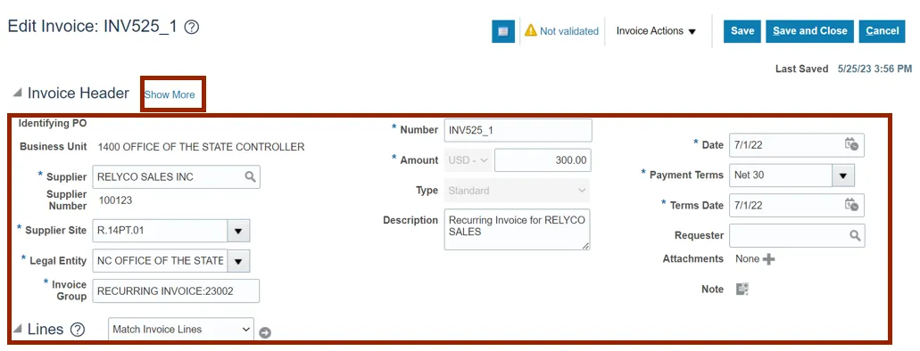 Step 15.    The Edit Invoice page is displayed. Validate and update the invoice details if necessary. Click the Show More link to access more information on the invoice.