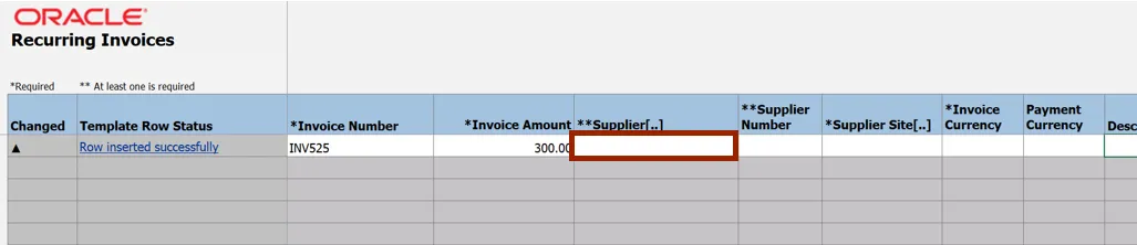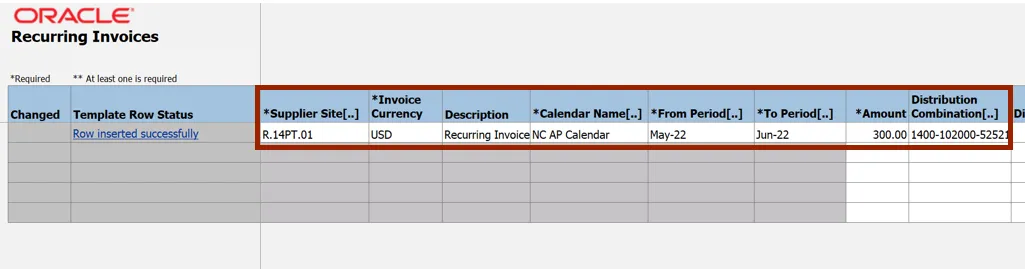 Step 7.    The CreateRecurringInvoices.xlsm file displays a table to enter the invoice details. Enter the invoice details in all the mandatory fields (marked with *).