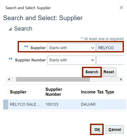 Step 9.    The Search and Select pop-up appears. Enter the Supplier name in the Supplier field and click the Search button. Click the OK button. In this example, we choose RELYCO SALES INC.