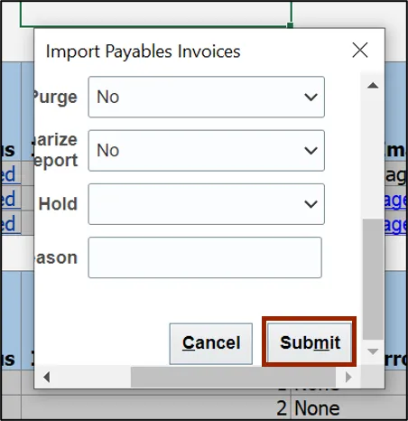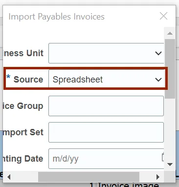 Step 13. The Import Payables Invoices pop-up appears. Enter the relevant details in the mandatory fields (marked with *).
