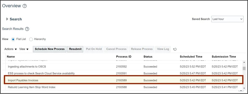 Step 16. Navigate to NCFS Login >> Tools >> Scheduled Processes. The Overview page is displayed. Scroll down to view the status of the applicable Process ID.