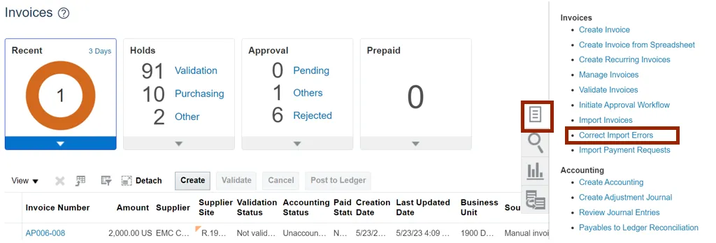 Step 3. The Invoices dashboard is displayed. Click the Tasks icon and click Correct Import Errors.