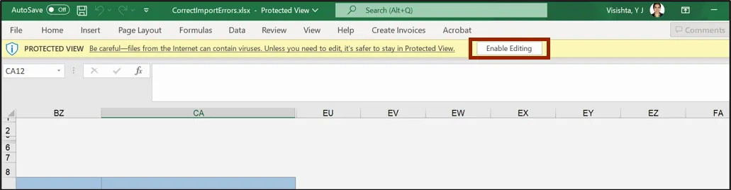 Step 4. On the CorrectImportErrors.xlsx file, click the Enable Editing button.