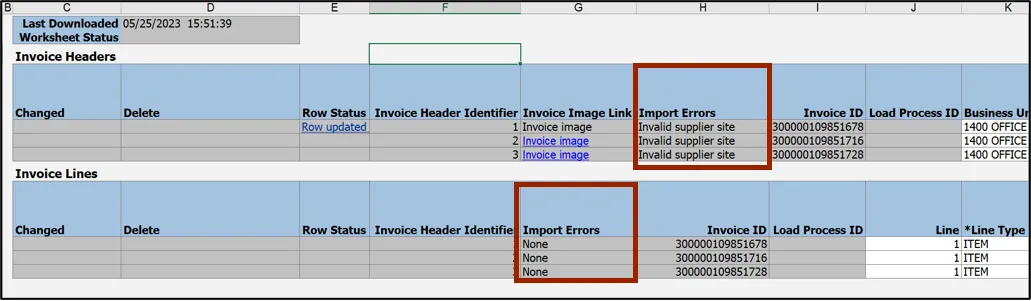 Step 7. The CorrectImportErrors.xlsx file displays all the invoices details along with the errors encountered during the import process. Review the Import Errors fields on Invoice Headers and Invoice Lines sections.