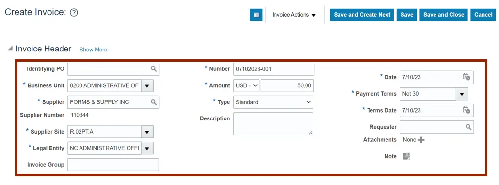 Step 4. The Create Invoice page opens. On the Invoice Header section, enter the details in the mandatory fields (marked with *).