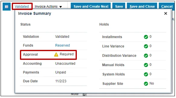 Step 14. Once the Invoice is Validated, click the Invoice Action drop-down button. Select Approval and Initiate from the Invoice Action drop-down choice list.