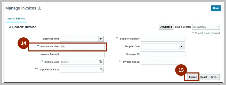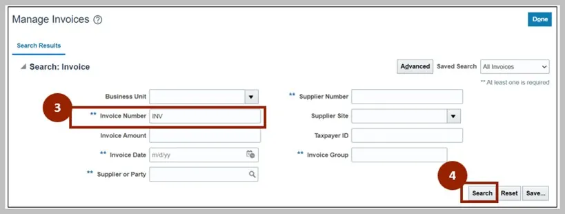 Step 3. Enter details in at least one of the fields marked "**". In this example, the Invoice Number has been entered.