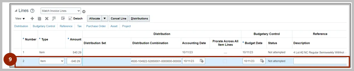 Step 9. Enter the original cost distribution from the PO as a negative line to negate the existing line.