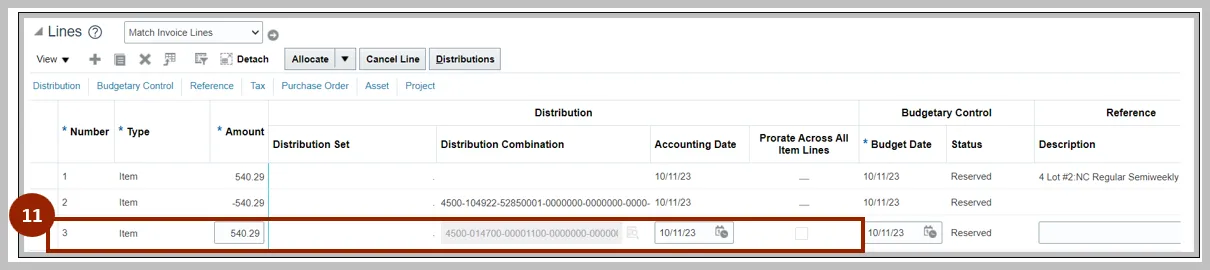 Step 11. Enter details in the new line. This distribution in this line should be the new distribution you want to use for the PO and should be equal to the previous negative line.