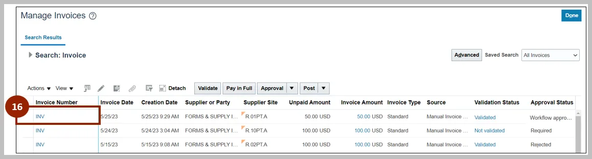 16. Click the Invoice Number link of the required line.