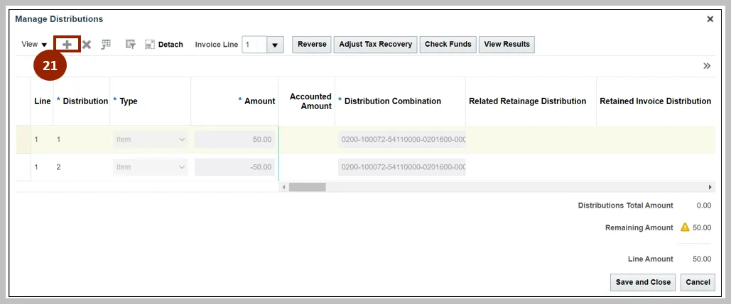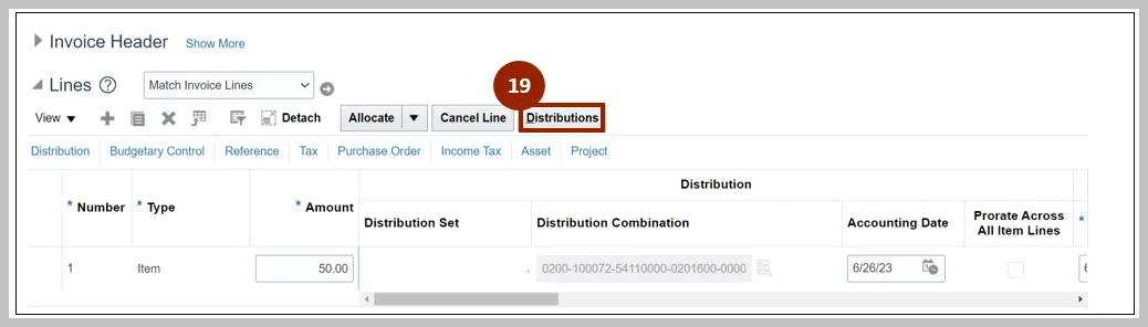 19. Click the Distribution button to update/correct the Distribution Combination.