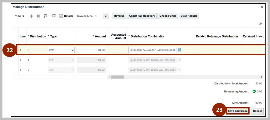 22. Enter details in the new line. This distribution in this line should be equal to the updated / corrected charge account.