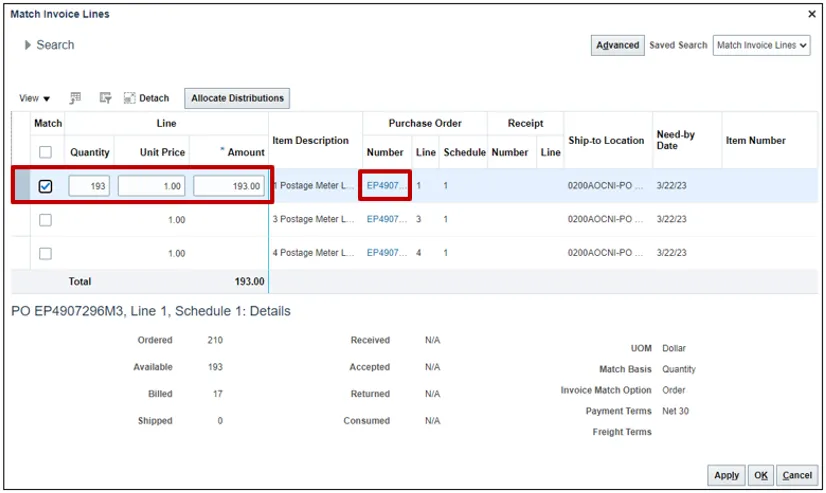 Step 9. Select the Match check box for the required line(s), and validate the Quantity, Unit Price, and Amount.
