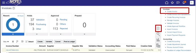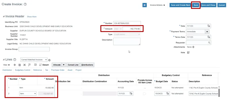 Step 11. Create Invoice page will be displayed. Review the negative amount in the invoice header and the lines. Click Save.