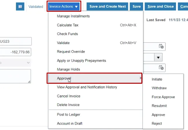 Step 6. Once the invoice is validated, click on Invoice Actions and Initiate Approval.