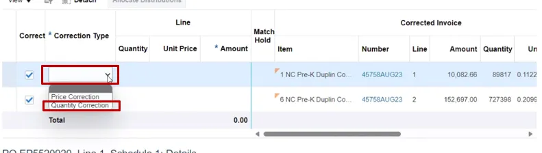Step 9. Once the lines are selected, click on the Correction Type drop down and select Quantity Correction.
