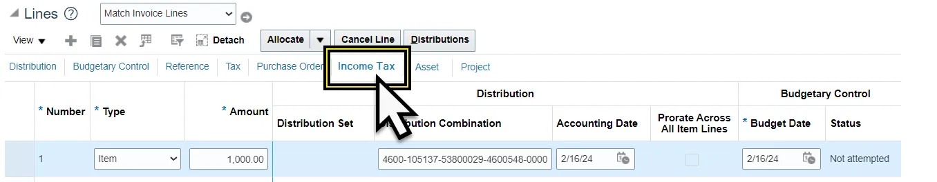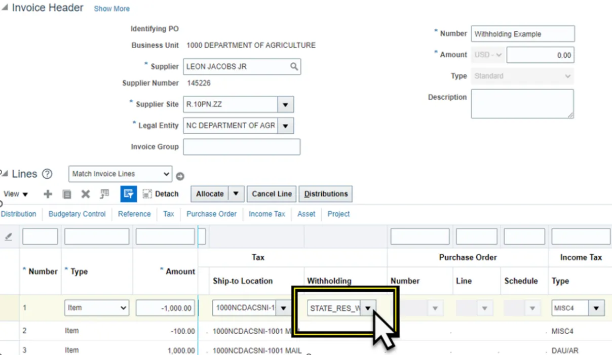 Step 8.    If the Income Tax is MISC4, remove the withholding description from the Withholding column if one is listed under the Tax Category. The invoice must be saved before the withholding description appears.