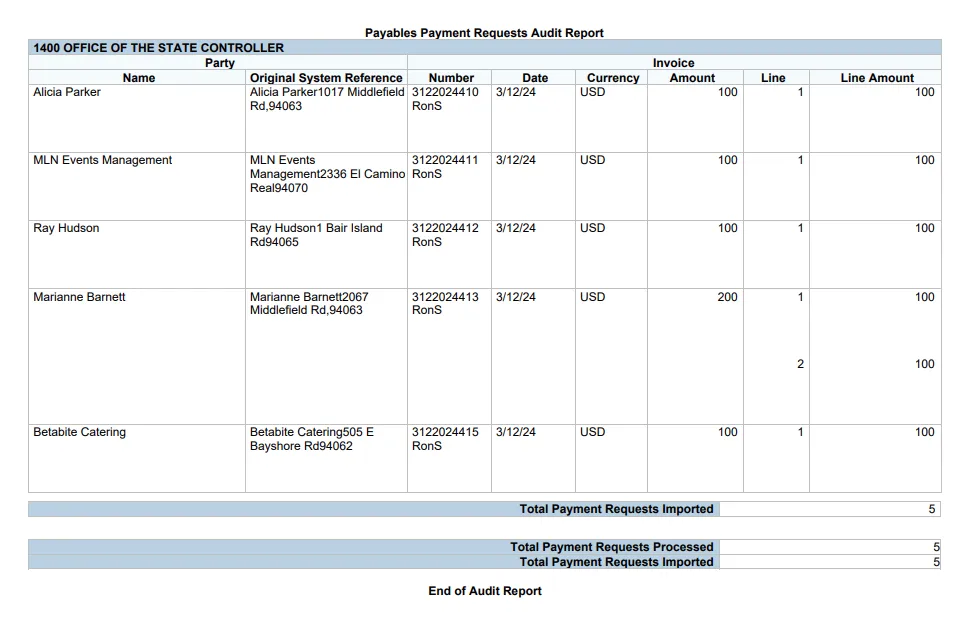 Step 24.    Reconcile the payment requests in the Audit Report section of the report to the transactions on the PayablesPaymentRequestImportTemplate.xlsm spreadsheet and verify no payments are on the Rejections Report.