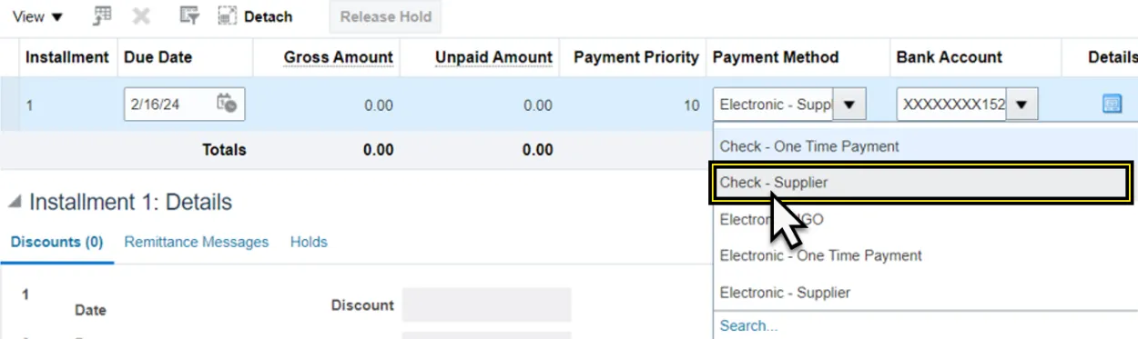 - When paying the Non-PO matched Zero Dollar invoice the Zero Dollar Check template will be used so that a $0 check is not printed when paying the Non-PO Zero Dollar invoice.