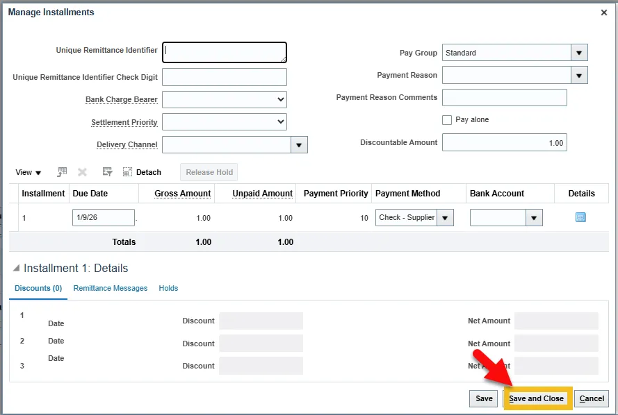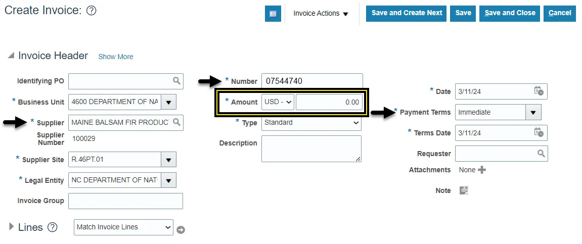 Step 6. Enter the supplier information, invoice number, set the payment terms to Immediate, and enter Zero (0.00) in the Amount field.