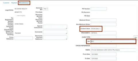 Step 7. Scroll down to the Manage Transactions page. Click the Miscellaneous tab. Click the Context Value drop-down choice list, then select NCAS Data and click the DIV drop-down choice list, then select WO.