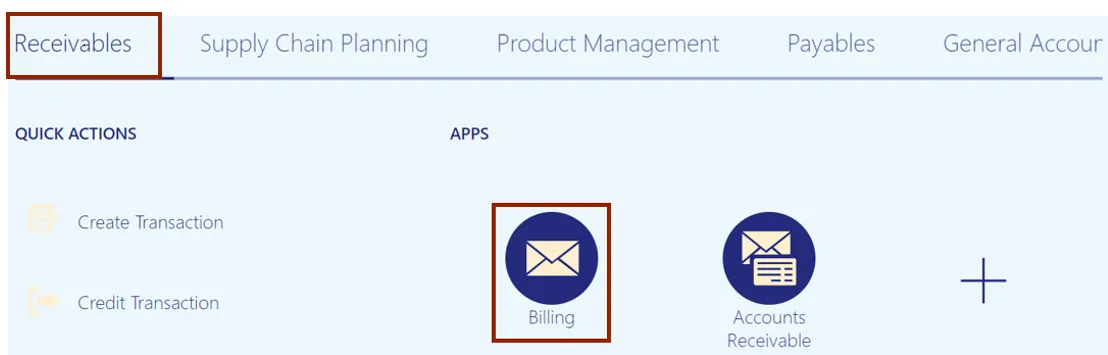 Step 2. On the Home page, click the Receivables tab and click the Billing app.