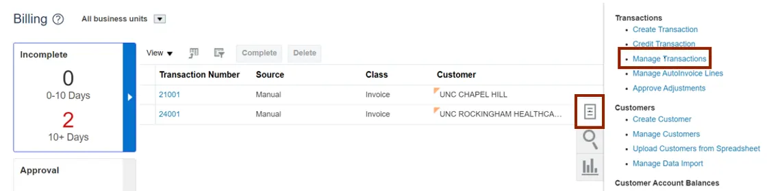 Step 3. On the Billing dashboard, click the Tasks icon and click Manage Transactions.