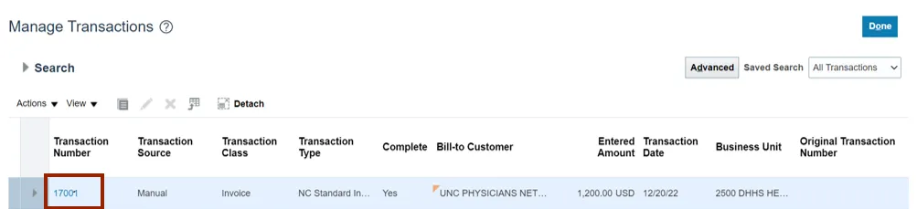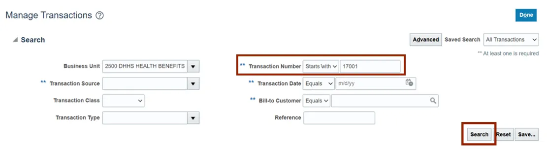 Step 4. The Manage Transactions page opens. Enter the Transaction Number in the Transaction Number field and click the Search button.