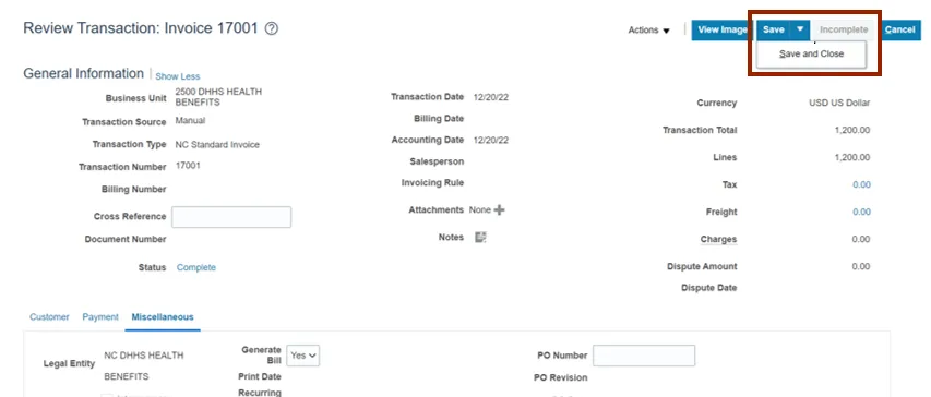 Step 8. Scroll up in the Review Transaction page. Click the Save drop-down choice list, then Save and Close.