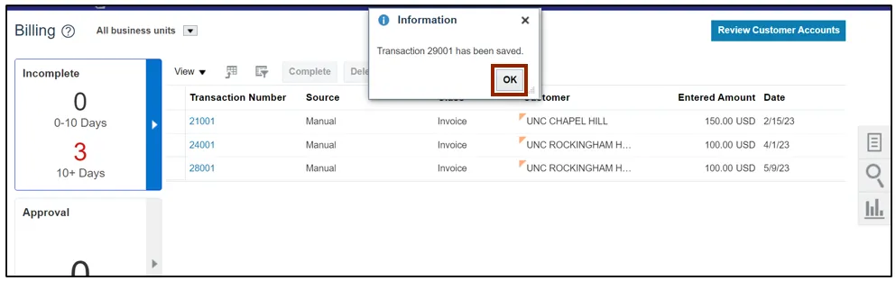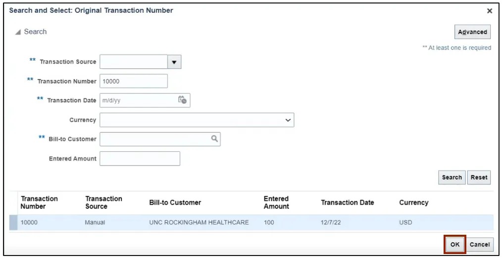Step 6. Select the Transaction Number and click the OK button to go back to the Create Credit Transaction screen.