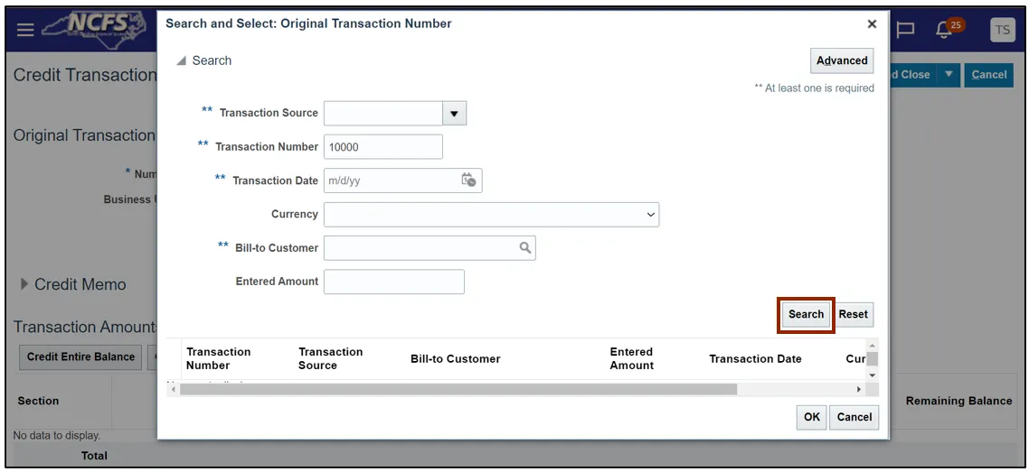 In this example, we choose: Manual for *Transaction Source, NC Credit Memo for *Transaction Type, and 10000 for *Transaction Number.