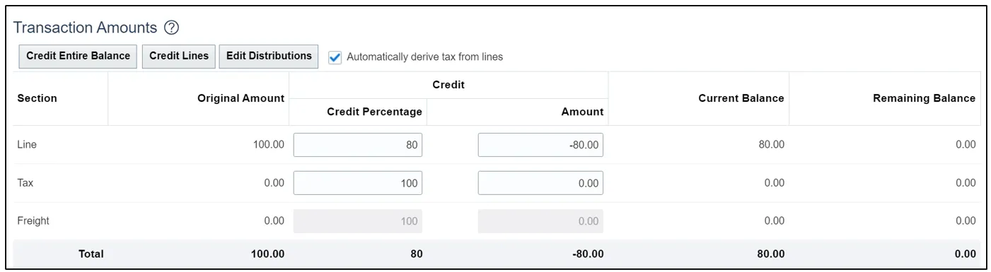 Note: You may choose to edit the Credit Percentage of the line to issue credit, or the Amount of the line to issue credit.