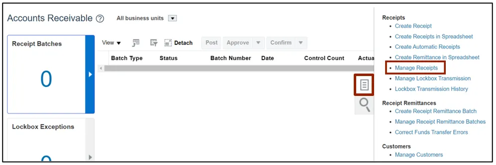 Step 3. On the Accounts Receivable dashboard, click the Tasks icon, and then click Manage Receipts.