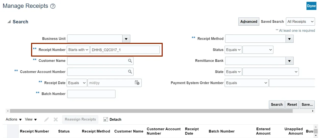 Step 4. On the Manage Receipts page, enter the Receipt Number in the Receipt Number field.