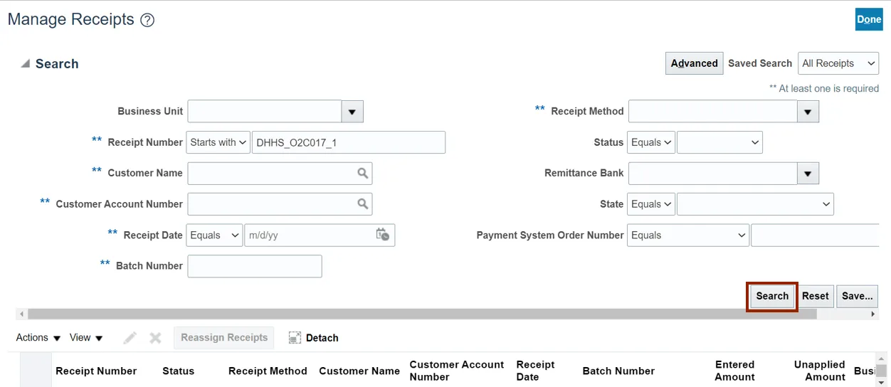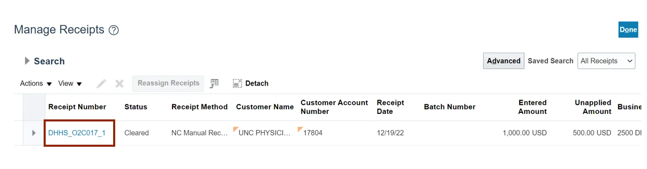 Step 6. Under the Search section, click the Receipt Number link to open the receipt.