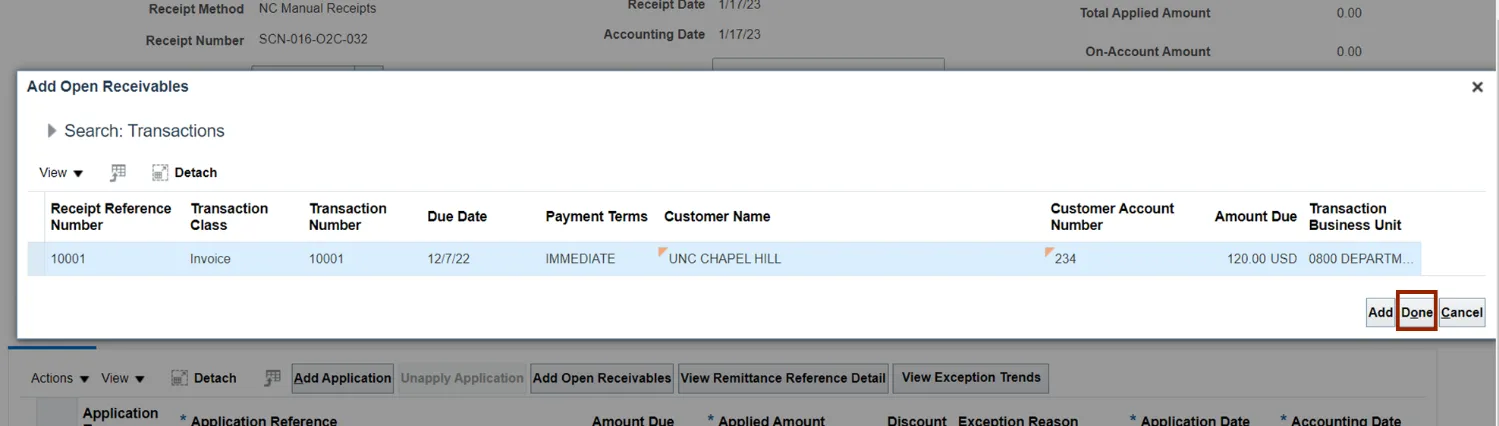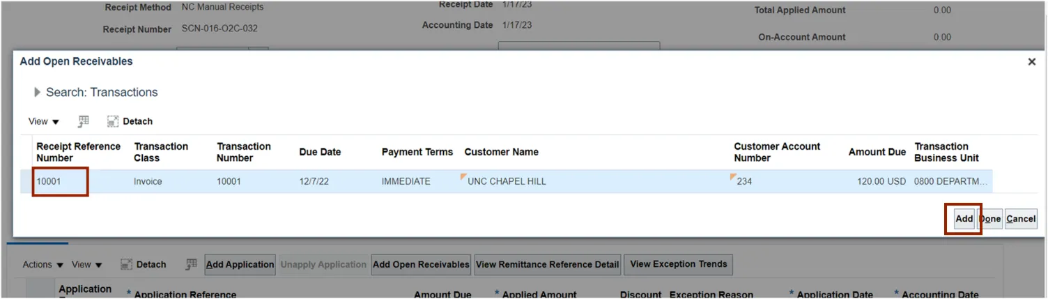 Step 10. The Add Open Receivables pop-up page appears, click the receipt row. Click the Add button.