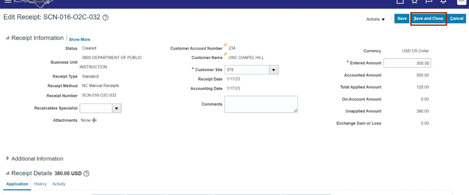 Step 12. Scroll up to the top of the page and click the Save and Close button to save the updates to the receipt.