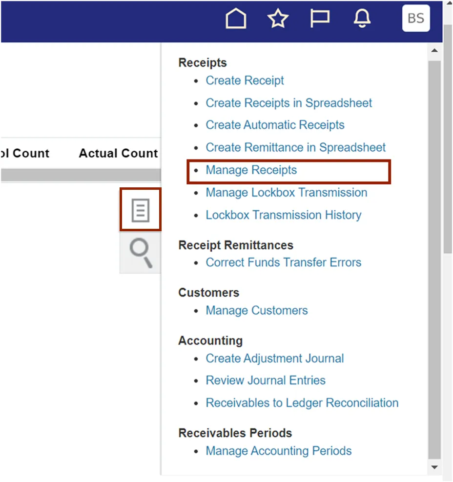Step 3. On the Accounts Receivables page, click the Tasks icon. Click the Manage Receipts.