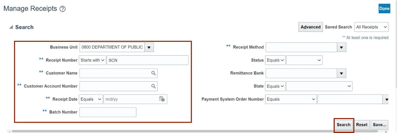Step 4. On the Manage Receipts page, enter the required search criteria as needed.