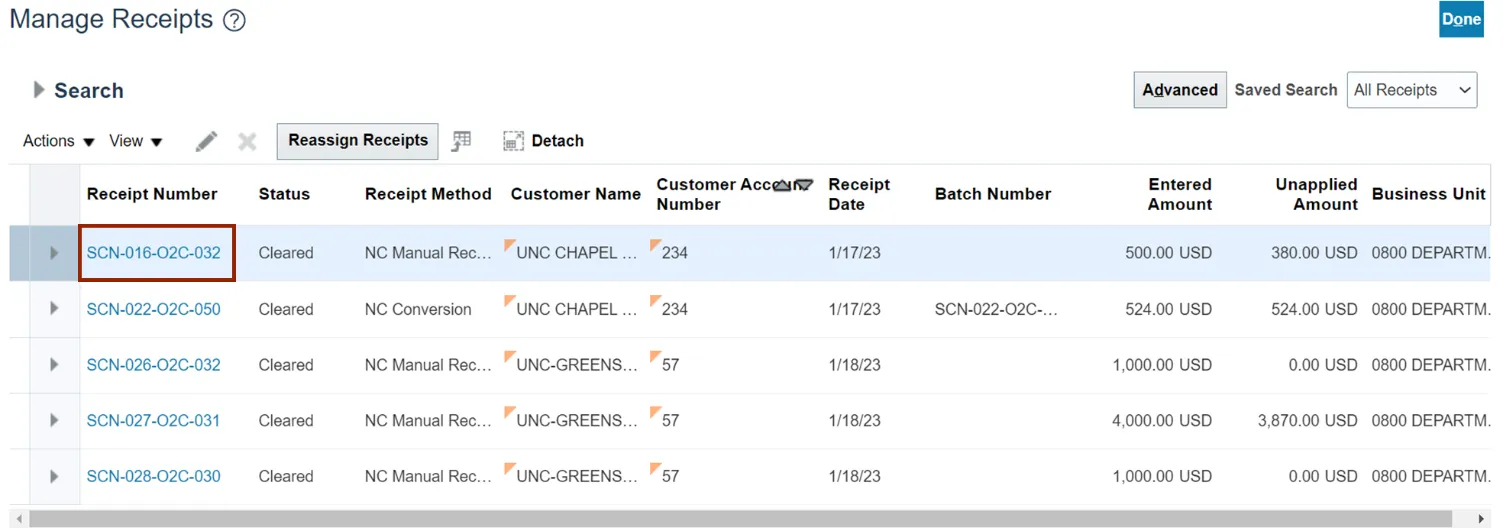 In this example, we choose Receipt Number as SCN. Click the Search button.