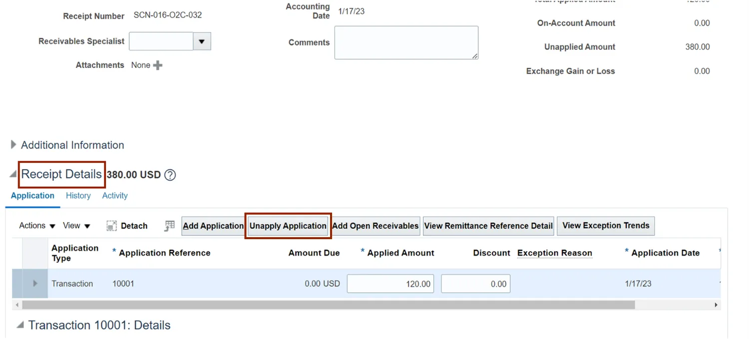 Step 6. On the Edit Receipt page, scroll down to Receipt Details section. Click the Unapply Application button.