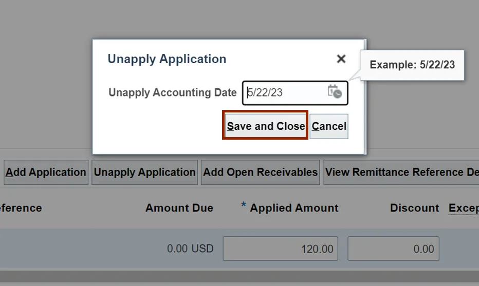 Step 7. The Unapply Application pop-up page appears, edit the date as needed and click the Save and Close button.