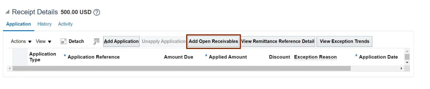 Step 8. Verify that the Receipt Details does not show the unapplied application performed in above step. On the Receipt Details section, click the Add Open Receivables button.